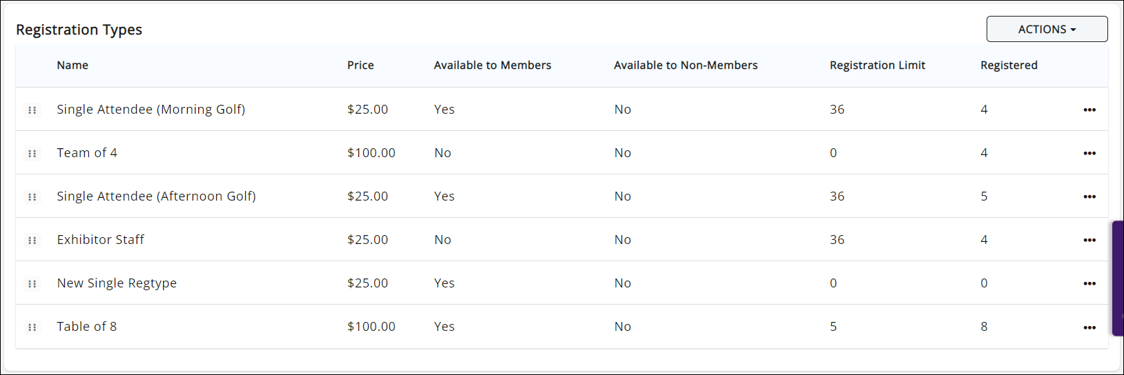 You may also change the order of the registration types by dragging and dropping them into the preferred position in the list. See Change the Order in which Registration Types are Displayed on your Event Page for more information.