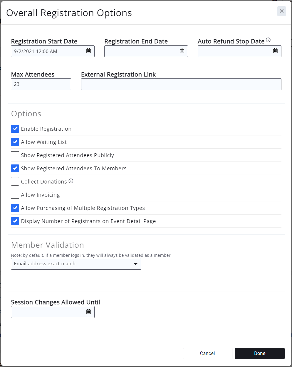 These selections will determine when registration becomes available, when registration is closed, how many total attendees are allowed, etc.