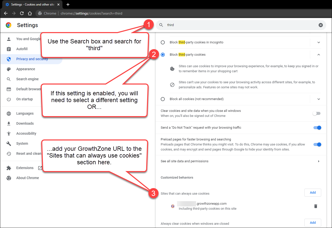 If you are using Chrome as your browser, you may need to adjust your browser settings. The Flatfile importer may not work if the "Block third-party cookies and site data" checkbox is set. To find the setting, open Chrome settings, type "third" in the search box, click the link in the "Cookies and other site settings" section, and look for the "Block third-party cookies" option. Either select a less-restrictive option, or add your GrowthZone URL (everything after "https://" and up to the first "/", as shown below) to the "Sites that can always use cookies" section (on a Mac this may be called "Manage Exceptions").