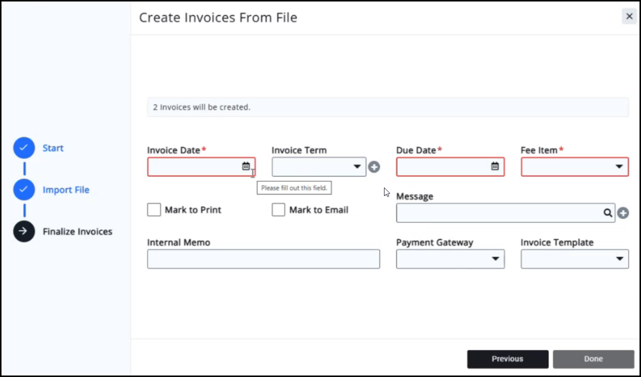 Click Submit to initiate the import. - Make any other adjustments to the options as your preference for these invoices and click Done to create the invoices.