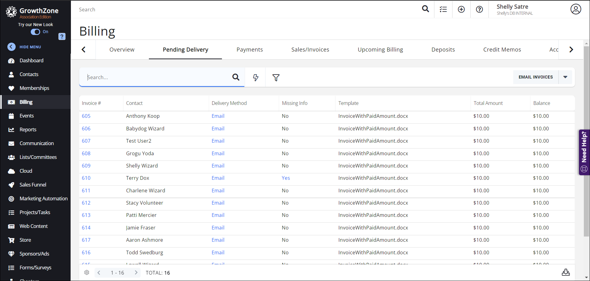 You will see a green success message at the top right, followed by a blue completion message. (If you are creating a large number of invoices, the blue message may take a while to appear.) The new invoices will appear in each contact record, the Pending Delivery tab (depending on what preferences were selected for delivery in the Edit Complete Import Invoices Options window), and the Sales/Invoices tab, just as any other invoice.