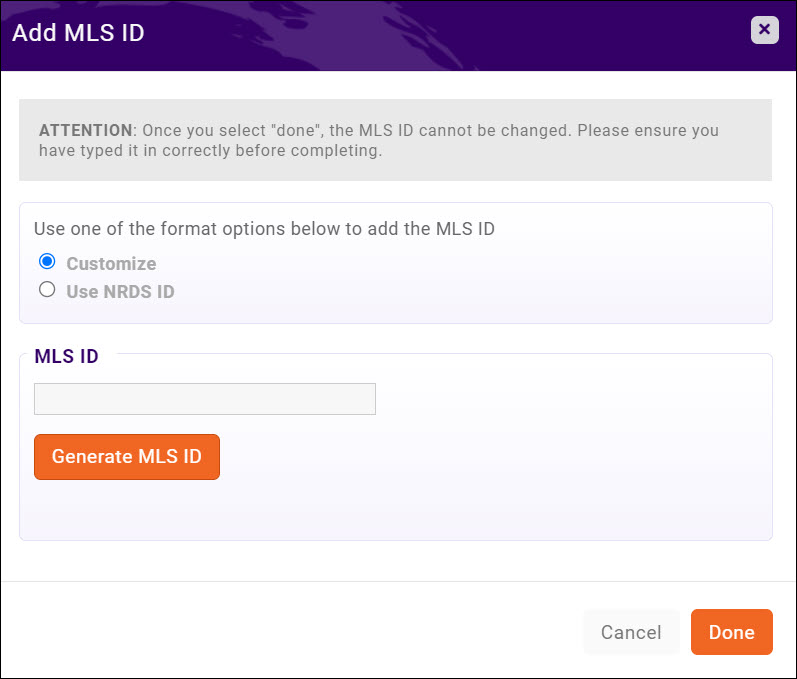 - Click Done. IMPORTANT: Once the MLS ID is saved, it cannot be changed. Ensure that the number is correct prior to clicking Done.