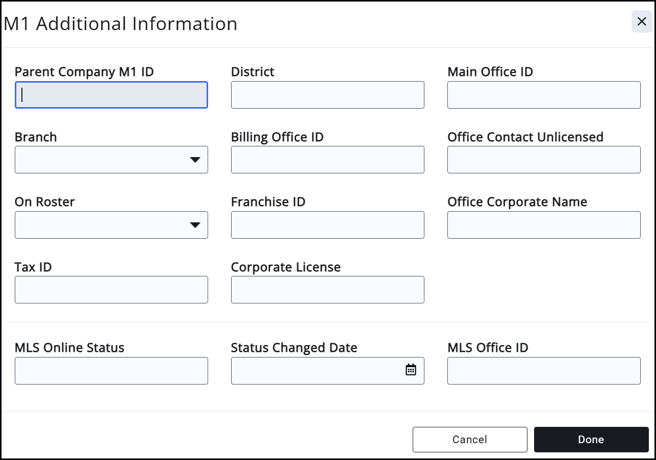 - Parent Company M1 ID: Used if this office location is affiliated with a parent company. Parent ID must be a valid 9-digit Office ID in M1 database. The system will check that any IDs in this field are valid Office IDs and are Active in M1. M1 will reject any office records that contain an Office ID in any of these fields that is the same as the Office ID of the office record itself. You cannot self-reference the Office record’s Office ID in these fields.