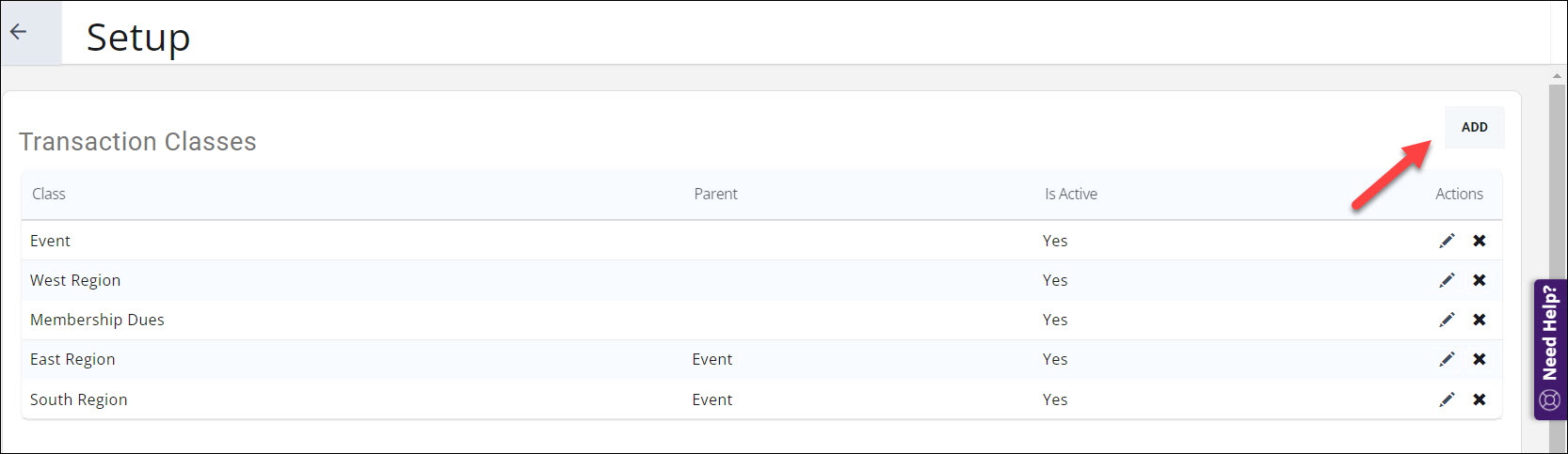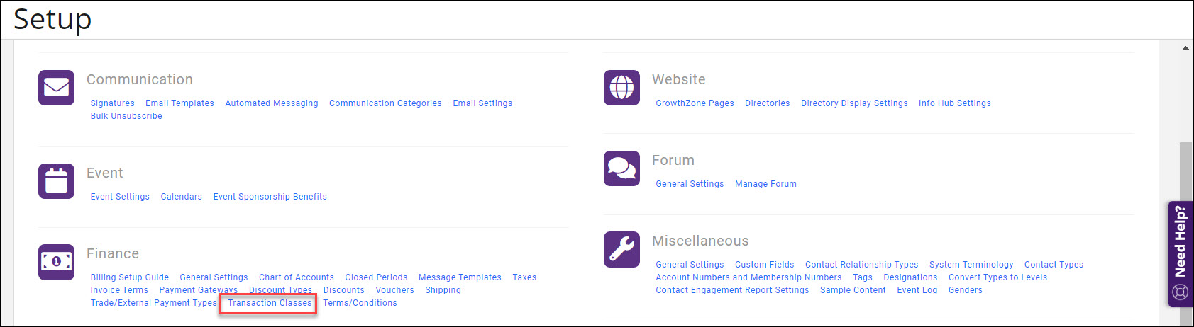 - Click Transaction Classes in the Finance section. A list of the transaction classes you have currently setup in your database will be displayed.