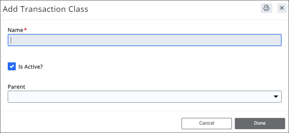 - Enter the Name of the transaction class. The name should match the transaction class in QuickBooks. Class names are limited to 31 characters per level.