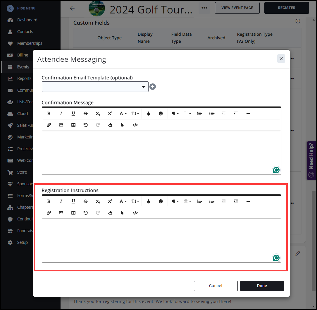 When setting up your event you will be able to select a custom confirmation email template, customize the confirmation page displayed after registration is completed, and enter instructions for registration.