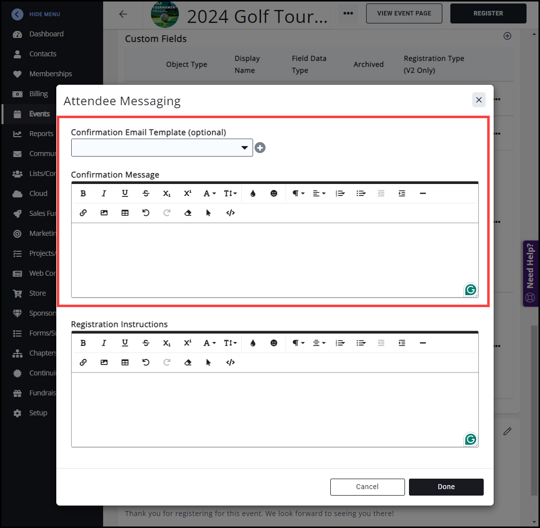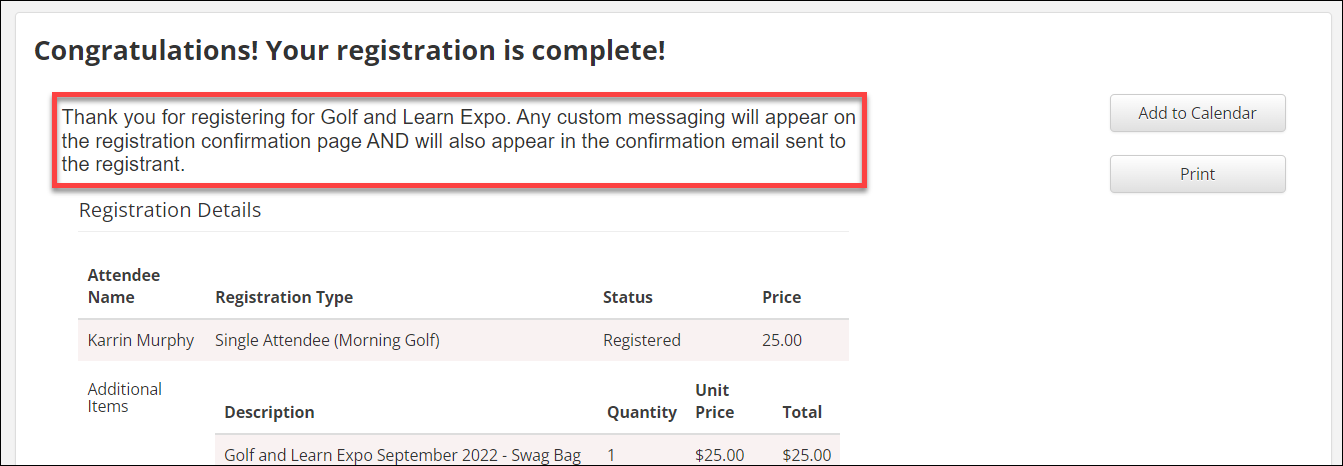 Text entered in the Confirmation Message section will display on the event registration confirmation page.