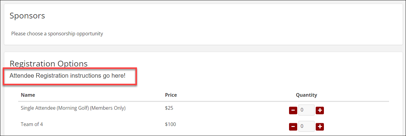 You can give specific directions as to registration processes and procedures here; this field will display directly above the registration types available for the contact on the event registration page.