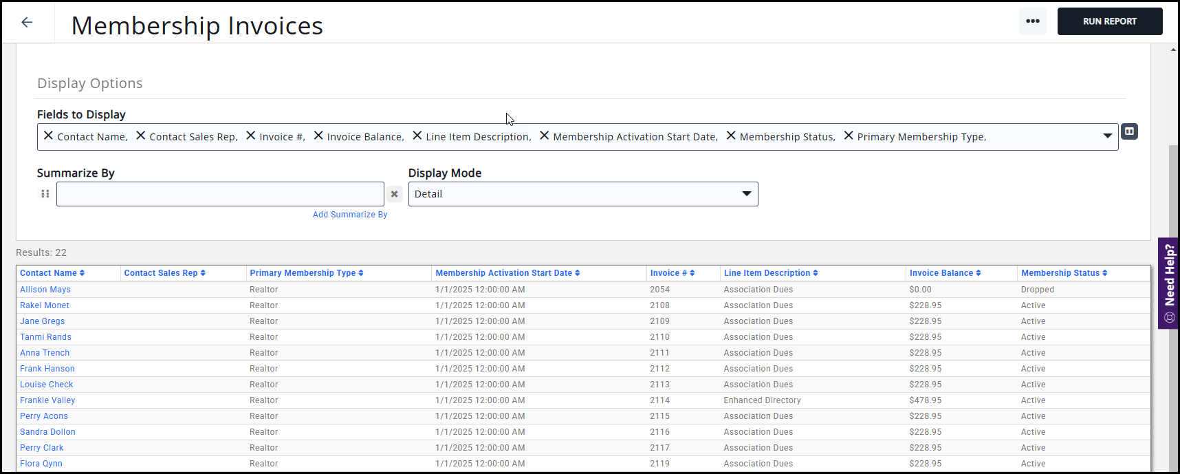 The Membership Invoices report allows you to generate a list of membership dues invoices to see what you have billed for in a given period and which invoices may still be open. For example, perhaps you wish to see a list of members who have renewed but not yet paid.