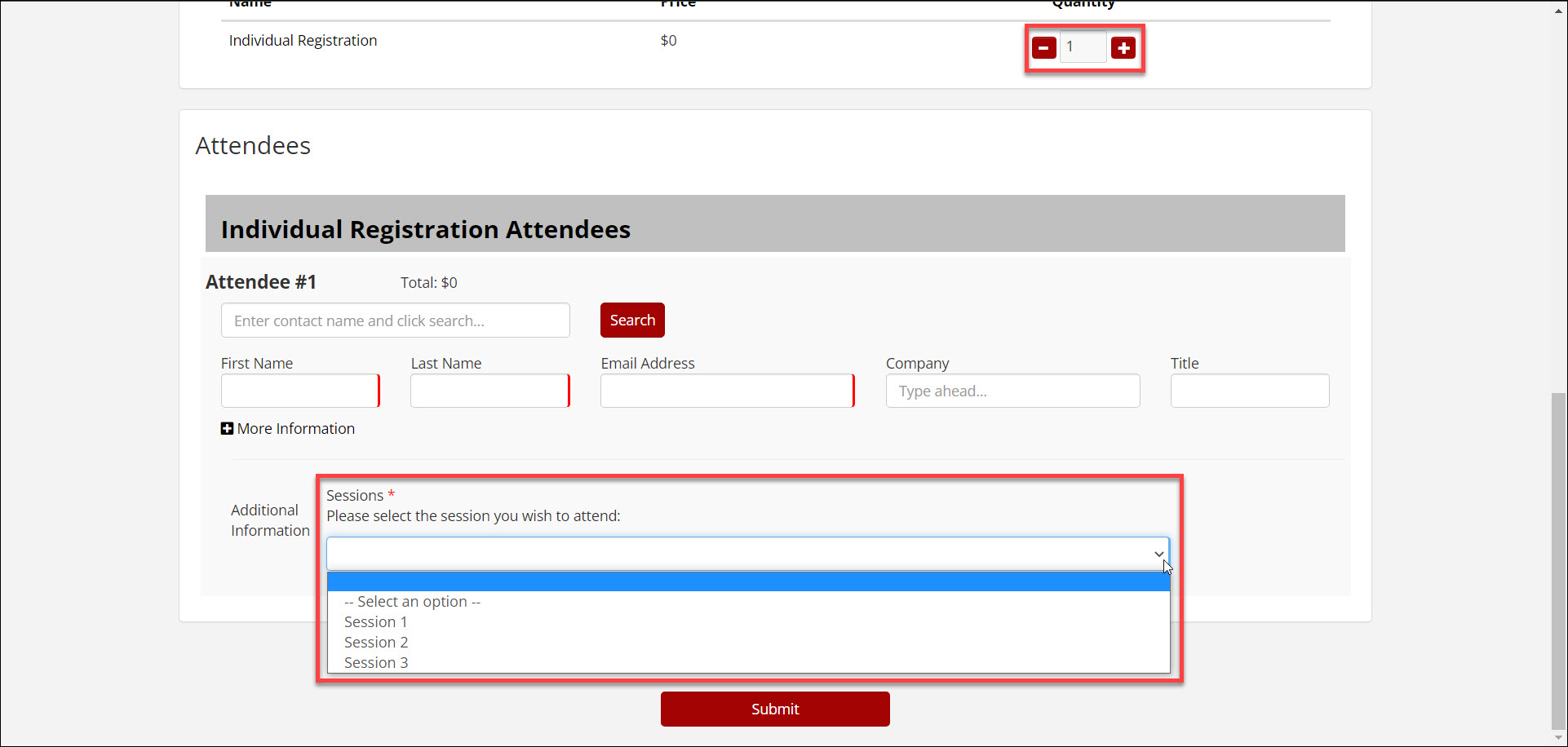 Repeat to add more selections (for example, if you have multiple timeslots requiring a session selection).