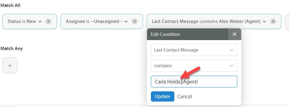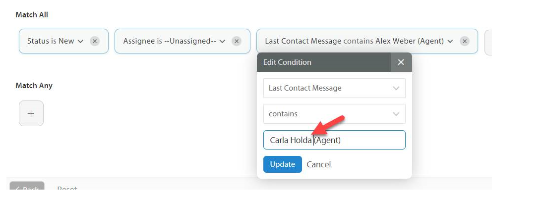 Click the drop down for Last Contact Message contains and replace the name (leave a space between name and agent) > Click update > next