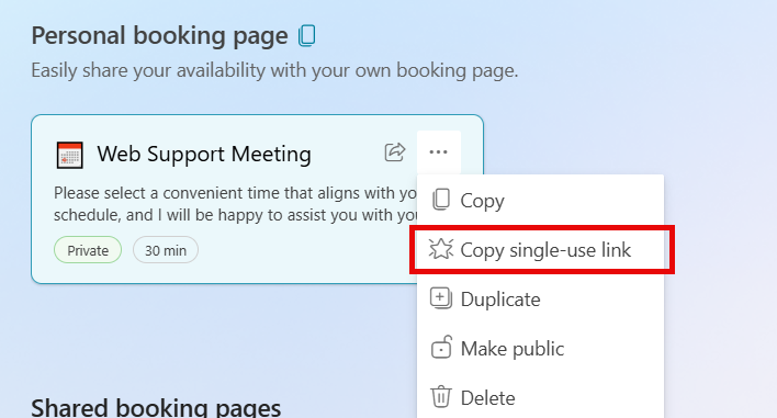 - When sharing the Booking link with a customer, click the COPY SINGLE USE LINK because if you click the COPY link and send that they can save it and setup random meeting times with you and skip the ticket queue which isn't fair for other customers.