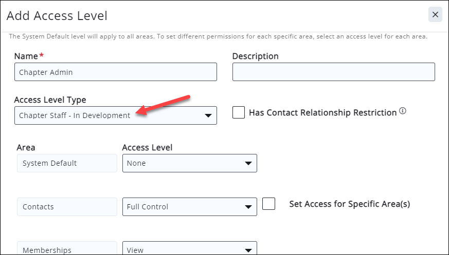 - Create a Staff Access Level of type 'Chapter Staff - In development'. See Create a New Staff Access Level. We recommend the following settings for this access level: