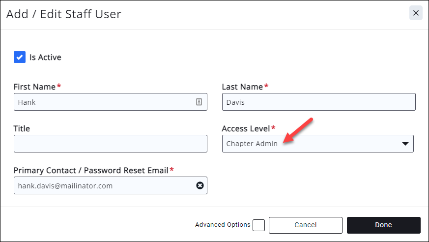 - Add the Chapter Owner as a staff member and assign he/she the access level created above. See Add a Staff Member.