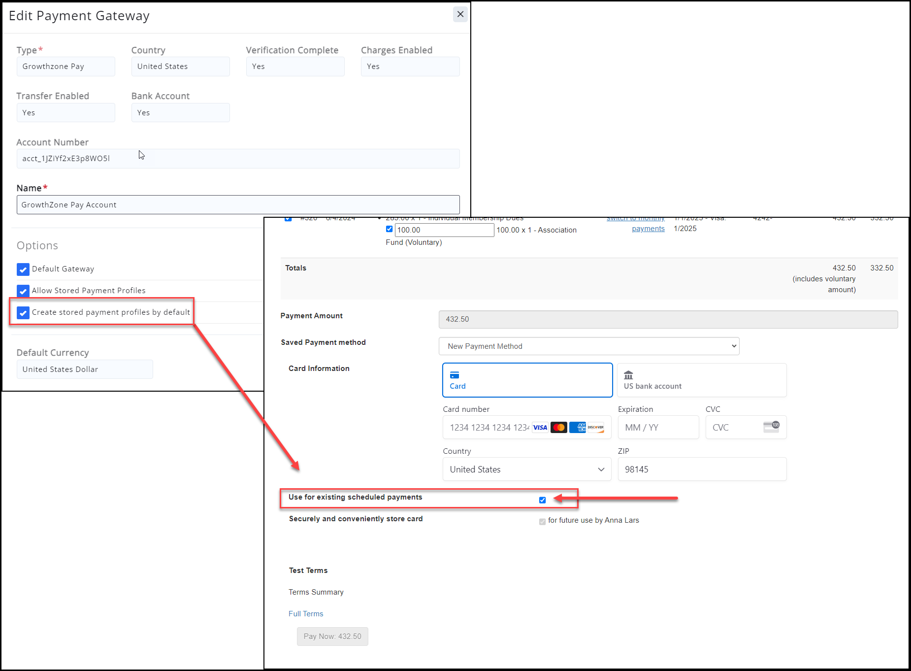 GrowthZone Pay allows your contacts to enter their credit card or bank account information into a secured page to pay invoices, event registration, donations, etc. By checking to save this account, users can apply this automatically to recurring fees (e.g. membership) or other one-time purchases. Creating your GrowthZone Pay gateway is a three step process.