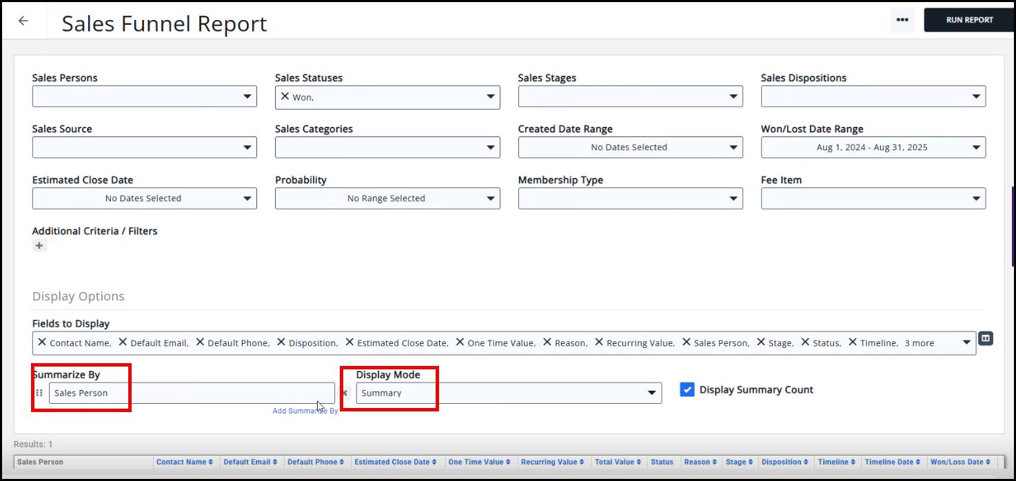 - You will use the Won/Loss Date in additional criteria to see the New and Won fields on the Sales Funnel Report.