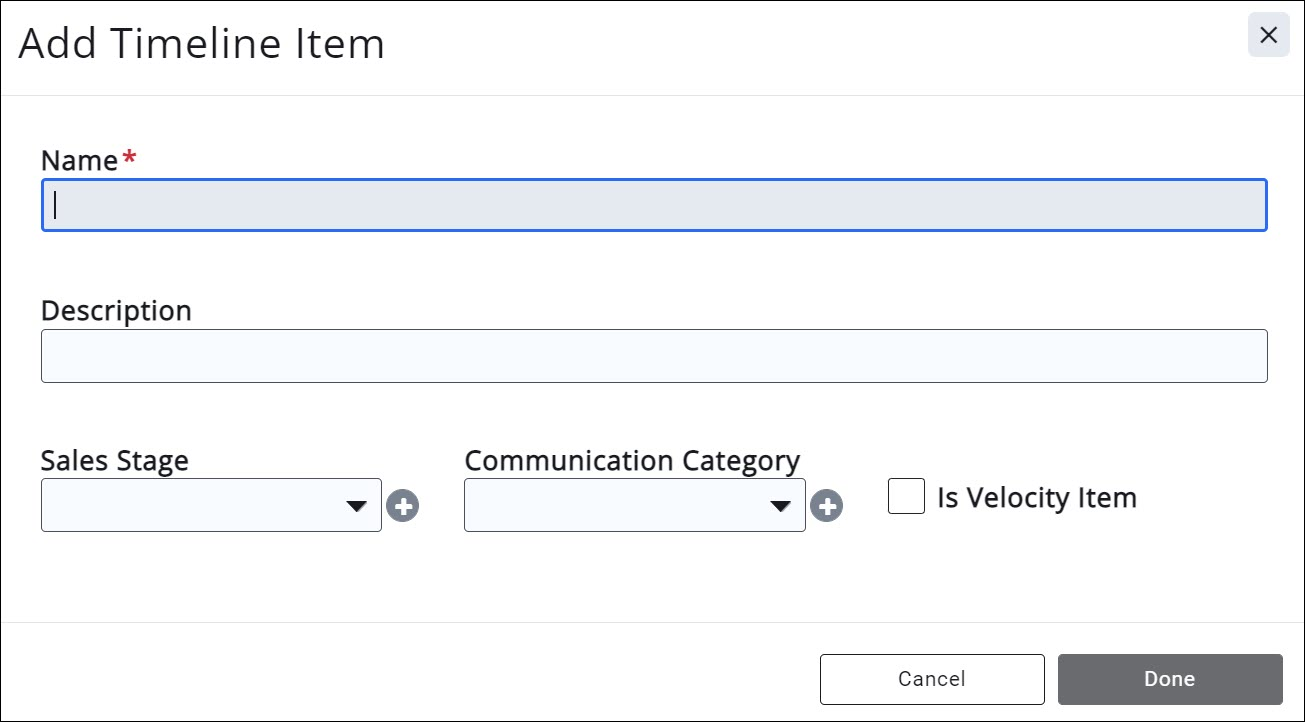 - Anything from the Sales Opportunity that is a Timeline Item included with the checkbox Is a Velocity Item, is summed with the recurring values over the past month to show the statistic in the Sales Velocity widget.