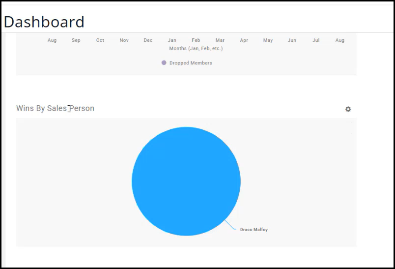 - Wins by Sales Person pulls from the Sales Funnel Report for its statistics. You will set the Status to 'Completed' and summarize by the salesperson's name to find your widget statistics. Set the Display Mode to Summary to view the items sold by the person.